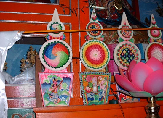 tormas dans le temple ; les couleurs sont mélangées au beurre clarifié, les éléments sont en relief
