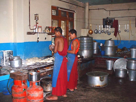 cuisine collective ici celle de l'école, les moines se relaient pour préparer les repas