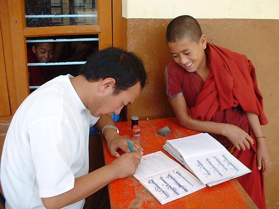 mais tous apprennent le tibétain écrit et oral tibetan models and corrections by teaecher with older pupils, all children learn tibetan language , classical teaching is giving in english |