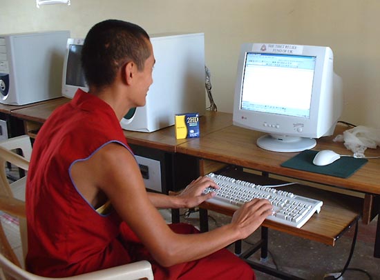 gymnastique .... computing class, training on tibetan text treatment on qwerty keyboard, here one monk in charge of computers |