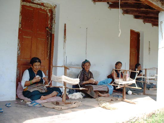 un travail que seules les vielles dames réalisent en bavardant ou en chantant, elles préparent les pelotes de laine pour le tissage