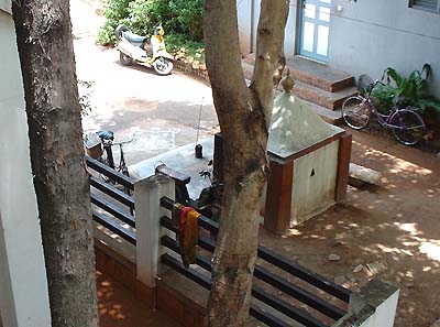 son royaume. et la preuve qu'on ne souffre pas trop, la photo à côté, c'est le petit temple de Shiva devant la maison que je vois de ma chaise quand je tends le nez au dessus de l'ordinateur et encore à hauteur des yeux, il y a un couple de corbeaux qui vient de faire un super nid (je surveille que tout se passe bien on vous tiendra au courant ) et parfois ce sont des écureuils qui jouent à se courser le long du tronc et sur les branches. |